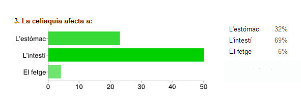 - Genètica i simptomatologia: quasi tres de cada quatre persones han indicat que la celiaquia és una malaltia genètica i possiblement hereditària. una mica menys de persones, un 68%, considera que provoca una pèrdua de la funcionalitat de les microvellositats intestinals, encara que un 15% ha indicat que estava relacionada amb l’estómac.