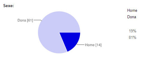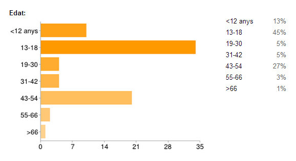 - Dades personals: hem rebut resposta de 75 persones, la majoria dones (81%). Pel que respecta a les franges d’edat, la majoria ha esta d’entre 13 i 18 anys (45%), mentre que la segona ha estat d’entre 43 i 54 anys (13%).