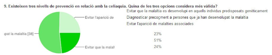- Prevenció: a la bibliografia consultada vam trobar que havia tres mecanismes de prevenció en relació amb la celiaquia. Es va demanar quin seria el més adequat. Un 51% considera que “diagnosticar precoçment a persones que han desenvolupat la malaltia” és la millor opció en relació amb la prevenció.